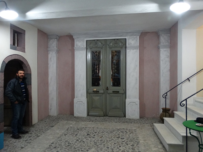 Μπροστά στο υπόγειο ένα χώρος γειτονιάς. Μέχρι και νεοκλασική οικία με ξύλινη πόρτα με μάρμαρα. Όλα ένα σκηνικό. Σε μια άκρη ο Λουκάς χαμογέλούσε με την έκπληξη μας για το δημιούργημα του (φωτ. Εν Άνδρω).