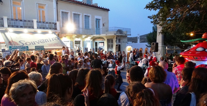 Στην έκδήλωση χόρεψαν το χορευτικό του συλλόγου και τα χορευτικά από Σέριφο και Σύρο που ήθραν για να χορέψουν το Σάββατο σε εκδήλωση στο ανοιχτό θέατρο Άνδρου. Εδώ το χορευτικό με τα μικρά παιδιά του Συλλόγου Γυναικών, ενώ γύρω του πολύς κόισμος παρακολουθεί  (φωτ. Εν Άνδρω).