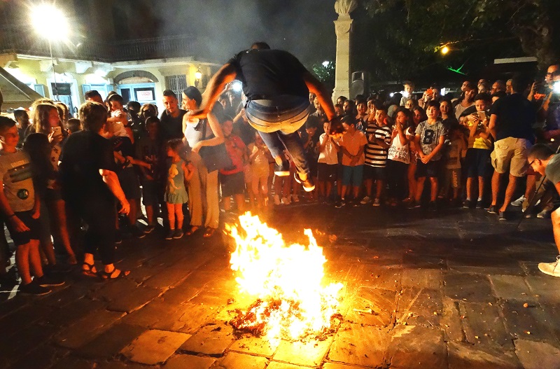 Η φωτιά άναψε με τα ξεραμένα μαγιάτικα στεφάνια που έπλεξαν κυρίες για την Πρωτομαγιά, τα κράστησαν και τα έφραν πια ξερά να τα κάψουν στην γιορτή του Κλήδονα κατά πως απαιτεί το έθιμο. Εδώ ένας ακόμα νεαρός σε ένα εντυπωσιακό άλμα πάνω από την φωτιά... (φωτ. Εν Άνδρω).