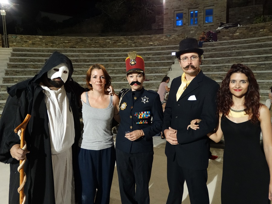 Η Θεώνη Ριντ (δεύτερη αριστερά) με ηθοποιούς της εξαιρετικής παράστασης "Το μεγάλο μας τσίρκο" στη διάρκεια πρόβας, καλοκαίρι 2016 (φωτ. Εν Άνδρω).