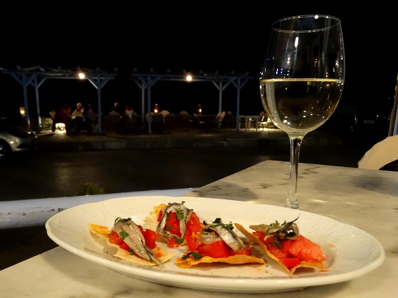 Την πρώτη στην Barbarola, του Μπάλλα, με θέα τα Πίσω Γιάλια και το ολόφωτο μεσημέρι, την δεύτερη στην παραλιακή Λϊθοδομή, του Ψωμά, με τη νυχτερινή πανσέληνο να αντιφεγγίζει στη θάλασσα. Στου Μπάλλα ο γαύρος μέσα στο λάδι του και τα μικρά κομμάτια σκόρδου και στου Ψωμά πάνω σε τορτίγια με ντομάτα και κομματάκια σκόρδου.