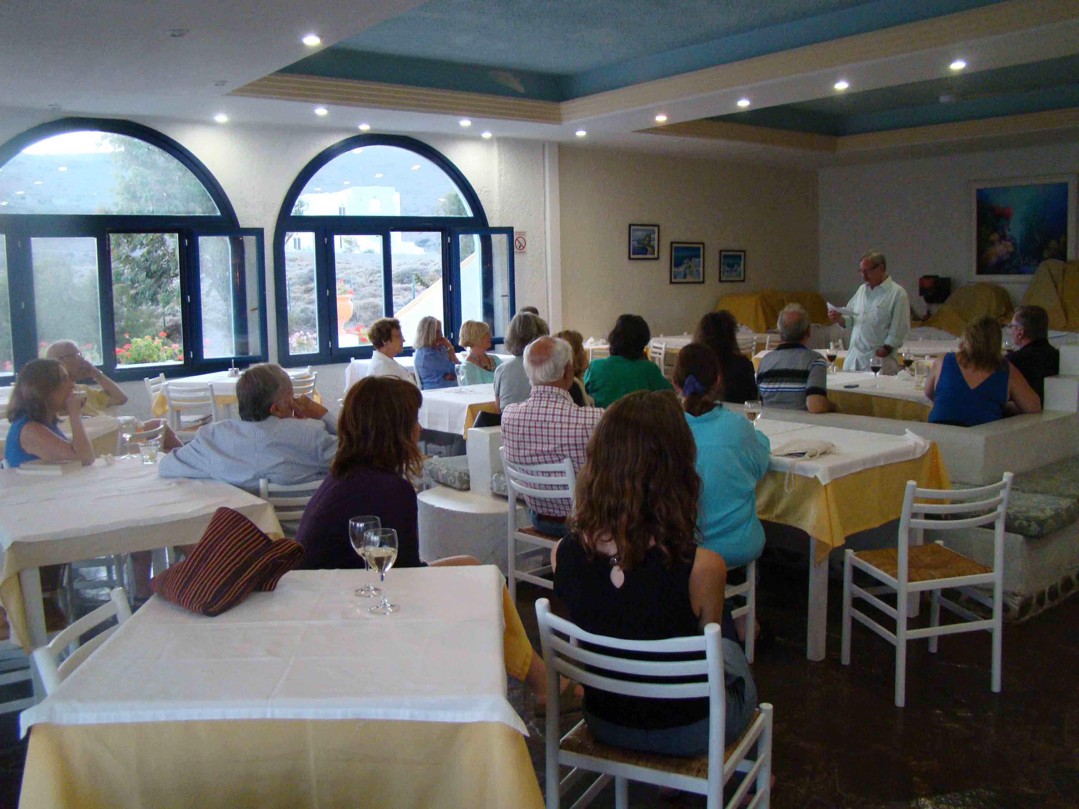 Κατά τα άλλα το σεμινάριο ήταν …σεμινάριο. Ο Τόμας Κένεντυ διάβασε μερικά σύντομα αποσπάσματα από τα βιβλία του. Εξήγησε τη σχέση τους με τη ζωή. (Λίγο ανεξήγητο ήταν το σκηνικό του υπέροχου ροδαλού σούρουπου της Δυτικής Άνδρου έξω από τις μεγάλες τζαμαρίες του ξενοδοχείου σε σχέση με τα σκηνικά της Κοπεγχάγης. Αλλά η θάλασσα, παρά τις διαφορές της, σα να γεφύρωνε τις αποστάσεις).