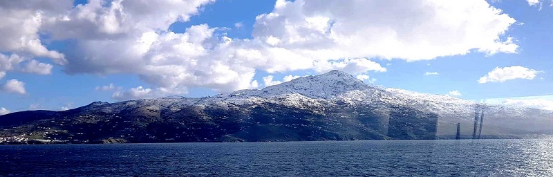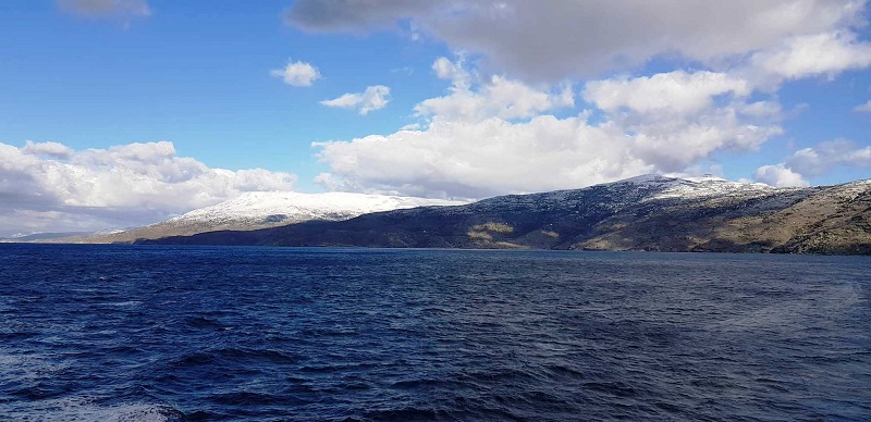 Άλλη μια φωτογραφία των χιονισμένων κορυφών της Κεντρικής Άνδρου από το πλοίο. Ότι και να πει κανείς για την υπέροχη και άγρια ομορφιά του χειμώνα στην Άνδρο είναι λίγο... (φωτ. Εν Άνδρω).