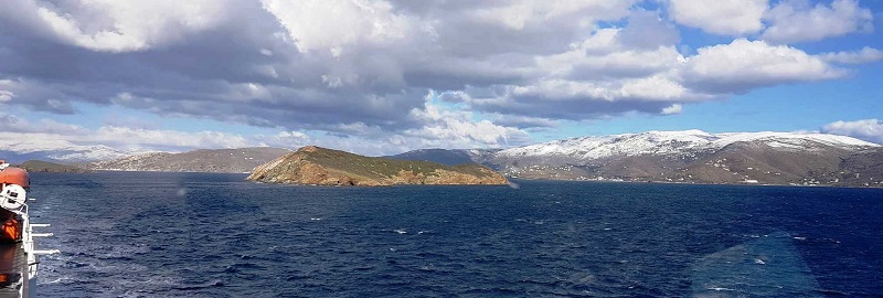 Το πλοίο αφήνει πίσω του το Γαύριο και το Μπατσί βλέπει μπροστά στο βάθος την χιονισμένη Κουβάρα. Εικόνε εξαιρετικά εντυπωσιακή και μάλλον σπάνια (φωτ. Εν Άνδρω).