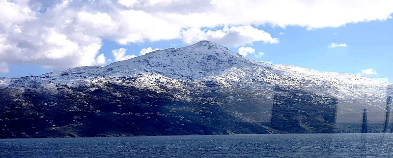 Ακολούθως το πλοίο πέρασε μπροστά από την Παλαιόπολη και την χιονισμένη Κουβάρα από πάνω της. Σκηνές από άλλες περιοχές σε μια Άνδρο που πάντα εκπλήττει με τις υπέροχες και απίθανες χειμερινές εναλλαγές της. Τέτοιες που σπάνια βλέπουμε σε νησιά των Κυκλάδων. Και βέβαια ποτέ στην άγρια ομορφιά της Άνδρου μιας και το ανάγλυφό της βοηθά να δημιουργούνται σπάνιες αντιθέσεις. Εδώ η Κουβάρα χιονισμένη με το ένα χιλιόμετρο ύψος της να δεσπόζει πάνω από την Παλαιόπολη και το Αιγαίο (φωτ. Εν Άνδρω).