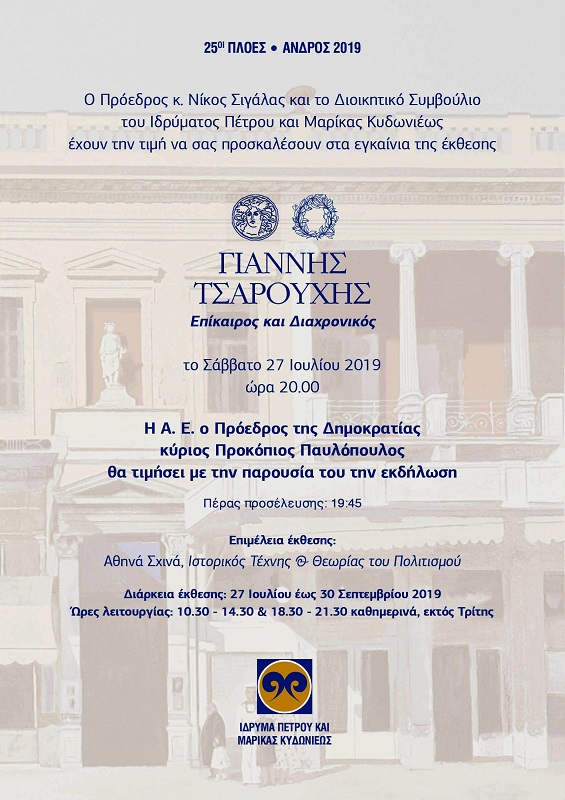 Συμπληρώνοντας το ένα τέταρτο αιώνα - 25 χρόνια - οι ετήσιοι Πλοές του Ιδρύματος Κυδωνιέα παρουσιάζουν το Σάββατο 27 Ιουλίου 2019 στις 20:00 την έκθεση του κορυφαίου ζωγράφου της γενιάς του 1930 Γιάννη Τσαρούχη.