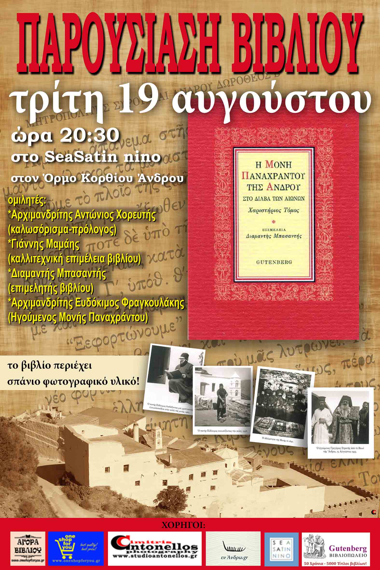 Μια τελευταία παρουσίαση του βιβλίου για την μακρά διαδρομή της Μονής Παναχράντου στο διάβα των αιώνων θα γίνει στο Κόρθι την Τρίτη 19 Αυγούστου και ώρα 20.30 στον χώρο του καφέ SeaSatin nino. Θα μιλήσουν για την έκδοση οι πατήρ - Αντώνιος (καλωσόρισμα - πρόλογος), Γιάννης Μαμάης (καλλιτεχνική επιμέλεια βιβλίου), Διαμαντής Μπασαντής (επιμελητής βιβλίου) και πατήρ - Ευδόκιμος (ηγούμενος Μονής Παναχράντου).