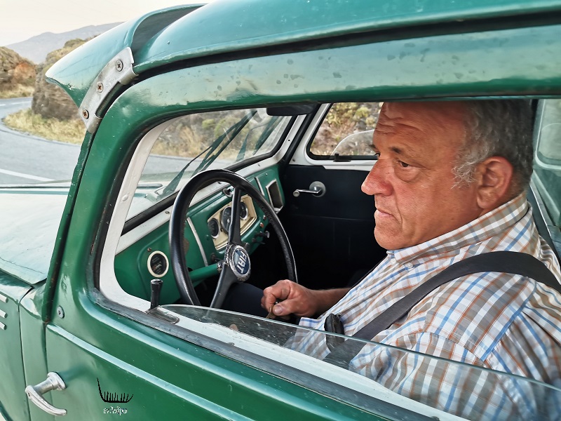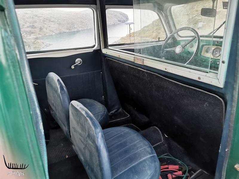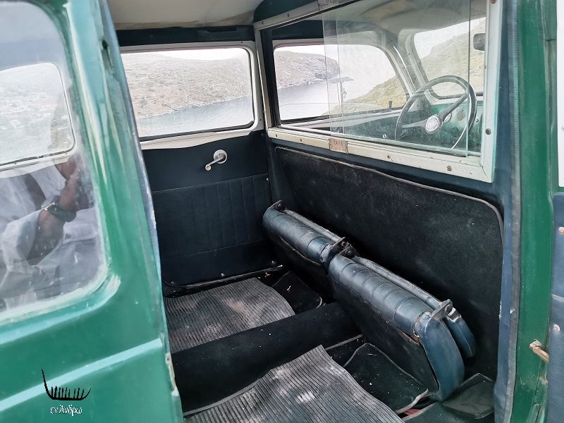 Πάνε μερικά χρόνια που μας έλεγε για το FIAT. Τότε όλο το τελείωνε, αλλά όλο και κάτι έλειπε. Όμως στο τέλος... το τελείωσε! Και τώρα κάνει τις διαδρομές του στο νησί με αυτό. Φρεσκοβαμμένο και αψεγάδιαστο εξωτερικά. Με πόρτες προπολεμικές που οι μπροστά ανοίγουν προς... τα εμπρός! Και οι πίσω προς τα πίσω. Σαν σκηνή από προπολεμική ταινία.
