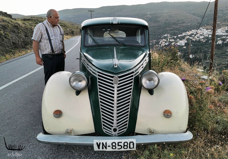 Το αυτοκίνητο το θυμόμαστε πριν μερικά χρόνια μαύρο και ακίνητο. Σήμερα το βλέπουμε με ιδιαίτερη χαρά πρασινομπέζ. Ένα πολύχρωμο στολίδι μιας άλλης εποχής στους δρόμους της Άνδρου. Μια ξεχωριστή νότα στη συχνά ρουρινιασμένη κι αδιάφορη καθημερινότητα του νησιού. Μια σκηνή που λες και βγήκε από κινηματογραφικό φιλμ της εποχής του Μουσολίνι. Μια εικόνα από παλιά ταινία της CINECITTA ακουμπισμένη πάνω από τα Γυάλια...