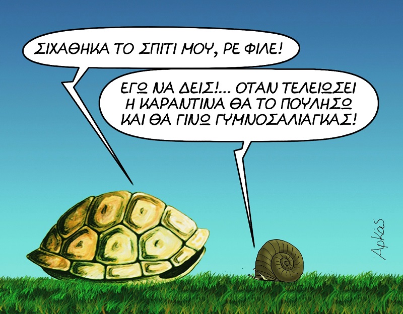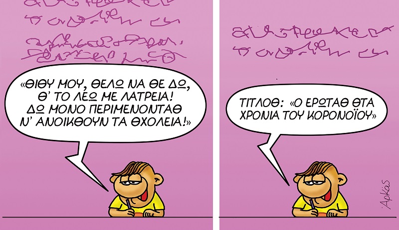Ο Αρκάς είναι, εκτός των άλλων, ο καλλιτέχνης που πρώτος και μάλιστα σε καθημερινή σχεδόν βάση, ανταποκρίθηκε δημιουργικά και «σχολίαζε» από την πρώτη κιόλας στιγμή, με το λεπτό του χιούμορ ή με σαρκασμό κι άλλοτε πάλι με ειρωνεία ή υπομειδίαμα, τα του κορονοϊού και της πανδημίας. Η έκθεση αυτή, όντας επίκαιρη, παρουσιάζει κι ένα εσωτερικό αφιέρωμα, από τον Αρκά, στον κορονοϊό (!) αντικαθρεφτίζοντας τις ποικίλες μας αντιδράσεις. Αυτός άλλωστε ήταν κι ένας επιπρόσθετος λόγος, για τον οποίο επελέγη να είναι εφέτος ο Αρκάς ο τιμώμενος καλλιτέχνης, του εικαστικού θεσμού «ΠΛΟΕΣ».