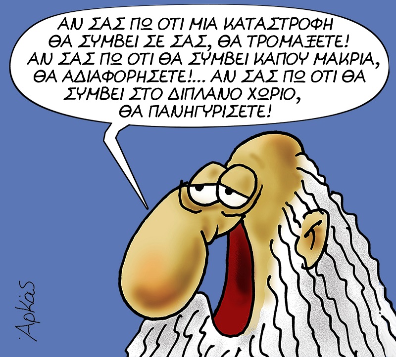Ο ίδιος ο Αρκάς (που υπογράφει πάντα τα έργα του με αυτό το ψευδώνυμο), ποτέ δεν εμφανίζεται σαν πρόσωπο, όχι από ιδιοτροπία αλλά από επιλογή να γνωστοποιείται μόνον μέσα από τα εικαστικά του δημιουργήματα. Είναι παντού και πουθενά, υπάρχοντας στην συνείδηση και διαβάζοντας την ίδια στιγμή το υποσυνείδητό μας. Ενώ μας είναι άγνωστος, τον αισθανόμαστε ως άνθρωπο της διπλανής μας πόρτας, μέσα από τις ιστορίες του, που μας είναι οικείες κι απροσδόκητες, ευφάνταστες κι ευρηματικές, βγάζοντας στην επιφάνεια όψεις κι εκδοχές από τον κρυμμένο μας εαυτό.