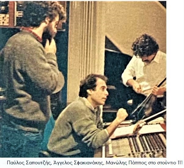 Καλέσαμε μια ομάδα εργασίας από μια νέα γενιά μουσικών. Μανώλης Πάππος μπουζούκι και πολλά άλλα, Σπύρος Γκούμας κιθάρα και πολλά άλλα. Ταλεντάρες που δεν τους ήξερε η πιάτσα και η βιομηχανία. Σε ένα τετρακάναλο κασέτας καταγράφτηκαν οι ενορχηστρώσεις των τραγουδιών. Εισαγωγές, απαντήσεις, θέματα. Τετρακάναλο ήταν η παρτιτούρα του αναλφάβητου. Με δύο μήνες περίπου δουλειά τα τραγούδια μορφοποιήθηκαν. Κλείνω στο 111 στο Μοσχάτο που ήταν συνεταίρος ο Παύλος Σαπουτζής, ο ηχολήπτης της Κομπανίας, αλλά τους είχα και αδυναμία.