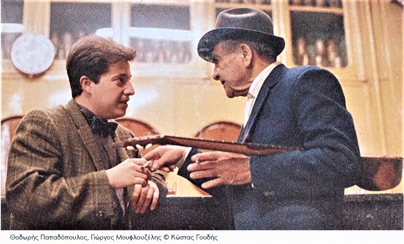 Σε επόμενο ραντεβού πήγαμε με τον Θοδωρή στη Λύρα να γνωριστούμε με τον Μουφλουζέλη. Ήταν ρεμπέτης αυθεντικός. Πότε καλοσυνάτος, πότε αψύς. Δεν ήθελε πολλές κουβέντες. Το σκουλαρίκι του Θοδωρή δεν το είχε πάρει με καλό μάτι. Θα έπρεπε να μας δώσει το υλικό. Συμφωνήσαμε μετά τη Λύρα να πάμε στο Γαλάτσι να ηχογραφήσουμε τα τραγούδια. Εγώ είχα ένα παπί. Ο Θοδωρής είχε μια διθέσια άσπρη Spider Gabrio. Έπρεπε να πάει με το Gabrio. Ο Μουφλουζέλης φρίκαρε. Γιατί δεν κλείνει από πάνω; Και θα μας βλέπουν όλοι; Ντρεπόταν. Του φαινόταν πολυτέλεια. Να πάω με την συγκοινωνία. Με τα πολλά τον πείσαμε. Στη διαδρομή κρατούσε το καπελάκι του κι έκρυβε το πρόσωπό του. Με το άλλο κρατούσε τον τζουρά. Στην αυλίτσα του, στο Γαλάτσι γράψαμε την πρώτη δόση των τραγουδιών.