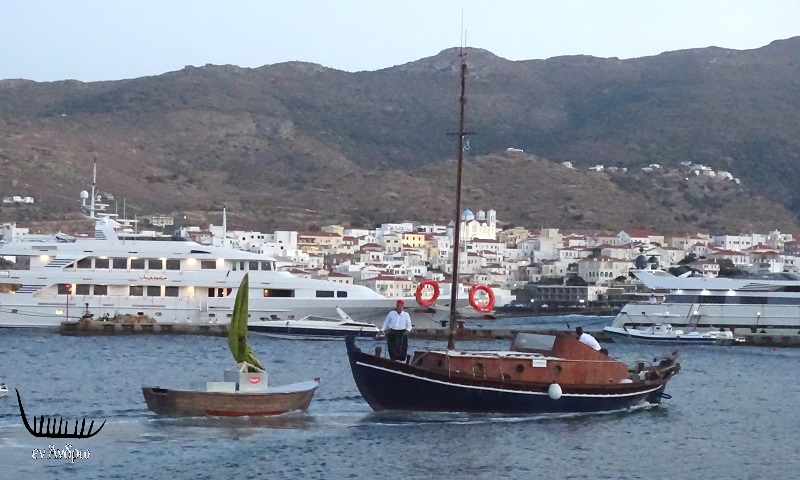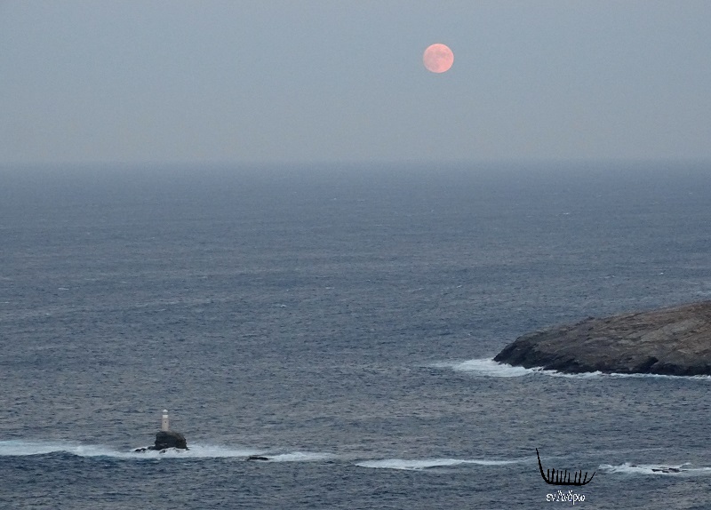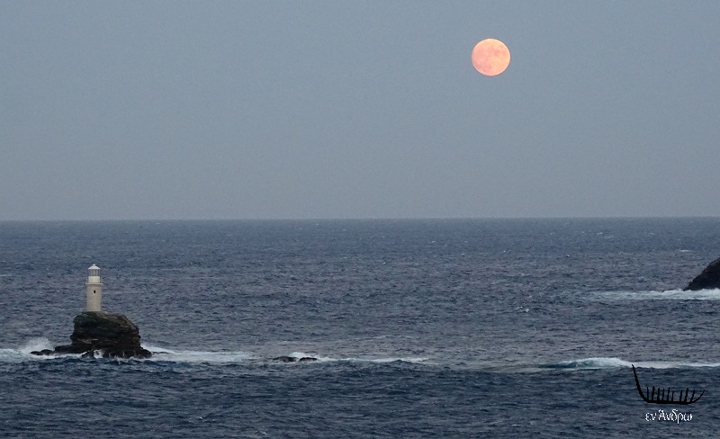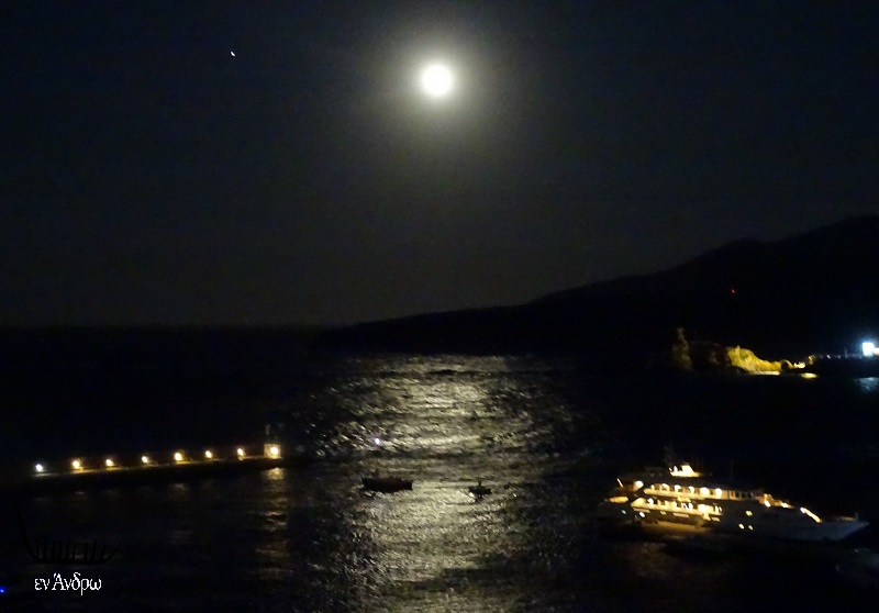 Ας ξεκινήσουμε χρονολογικά. Κατηφορίζοντας είδαμε την ανατολή στον ουράνιο ορίζοντα ενός μοναδικού φεγγαριού στις αποχρώσεις του ροζ, πριν γίνει λίγο μετά κίτρινο και ασημί στο τέλος. Οι χρωματισμοί της αυγουστιάτικης σελήνης ήταν και παραμένουν - λόγω ατμόσφαιρας - μοναδικοί. Χαμηλά ο μοναδικός Τουρλίτης που ταξιδεύει τα όνειρα της Άνδρου εδώ και 130 χρόνια...
