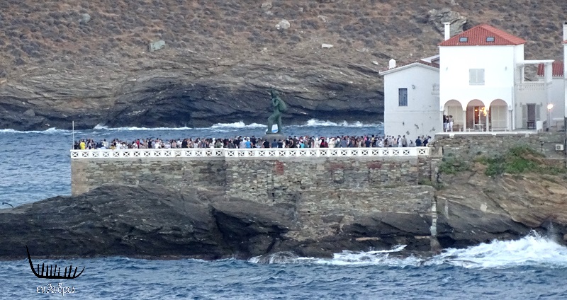 Πολλές εκατοντάδες οι θεατές στο ναό του Αγίου Γεωργίου όπου ξεκίνησε η εκδήλωση με την ύψωση της σημαίας και εκατοντάδες στην πλατεία του Αφανή Ναύτη μπροστά στο κάστρο και στα βράχια του όπου θα γινόταν η "αναπαράσταση" ενός γεγονότος - που δεν έγινε ποτέ στην Άνδρο. Όμως έγινε κάπου στην αντικρινή Χίο, όπου εστάλη και το σκάφος "Κανάρια" των Εμπειρίκων, σύμφωνα με το δημοτικό τετράστιχο: "Του Μπιρίκου της "Κανάρια"/ την επήραν στα Ψαρά/ να την κάνουνε μπουρλότο/ για να κάψουν τον Πασά...".