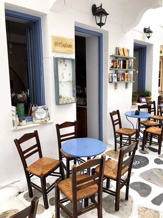 Πανέμορφο καφεβιβλιοπωλείο σε άκρως κυκλαδίτικο στυλ στην καρδιά της Χώρας, ο Αντίλαλος άνοιξε το 2017 και έκτοτε έχει αποκτήσει φανατικούς θαυμαστές, βιβλιόφιλους και μη. Τα ράφια του – μέσα κι έξω από το μαγαζί – είναι γεμάτα κυρίως παλιά βιβλία, διαλεγμένα στη κυριολεξία ένα-ένα, και κάποια λίγα καινούρια, τα οποία είναι όλα προς πώληση και μπορείτε να ξεφυλλίσετε ενώ απολαμβάνετε τον καφέ και το πρωινό σας. Οι ιδιοκτήτριες, Χριστίνα και Σοφία Κοράκη, συνδύασαν τον κεραυνοβόλο έρωτά τους για το νησί και την βαθιά αγάπη τους για τα μεταχειρισμένα βιβλία και έφτιαξαν αυτόν τον υπέροχο χώρο, ο οποίος επιπλέον συχνά φιλοξενεί σεμινάρια, εκθέσεις ζωγραφικής, εικαστικά εργαστήρια για παιδιά, λογοτεχνικές βραδιές, yoga retreats, μέχρι και κάποιες βραδιές σινεμά στην φανταστική σοφίτα που βρίσκεται στον πρώτο όροφο.