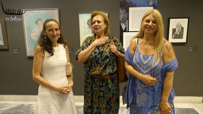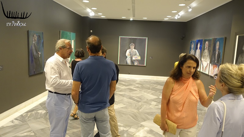 Στη φωτογραφία η πρόεδρος του Ιδρύματος F. Καραδόντη, μαζί με φιλότεχνες του νησιού, μπροστά στις προσωπογραφίες των αναφορών/επιρροών του Χρόνη Μπότσογλου...