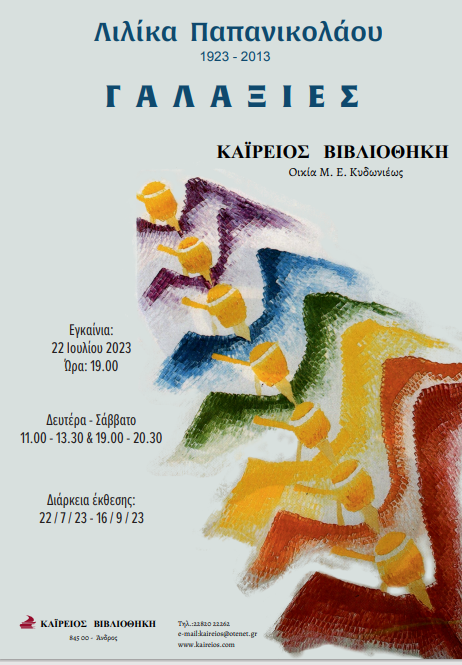 Τέλος τις καλοκαιρινές εκθέσεις των Ιδρυμάτων ολοκληρώνει το Ίδρυμα της Καΐρείου Βιβλιοθήκης όπως κάνει εδώ και πολλά χρόνια. Η Καΐρειος Βιβλιοθήκη. λοιπόν, παρουσιάζει την έκθεση ΓΑΛΑΞΙΕΣ της Λιλίκας Παπανικολάου (1923-2013) ΄στις 22/7, συμβάλλοντας με τον τρόπο της στο άνοιγμα της καλοκαιρινής πολιτιστικής ατζέντας της Άνδρου. Χρόνια τώρα η Καΐρειος με τις συνεχείς καλοκαιρινές εκθέσεις της διευρύνει τα καλοκαιρινά δρώμενα του νησιού. Επισκέπτες και φίλοι του νησιού έχουν τη δυνατότητα να διαβούν τις πόρτες του υπέροχου κτιρίου Μ.Ε. Κυδωνιέως και να δουν κάθε φορά σημαντικά στοιχεία από διάφορους δημιουργούς.