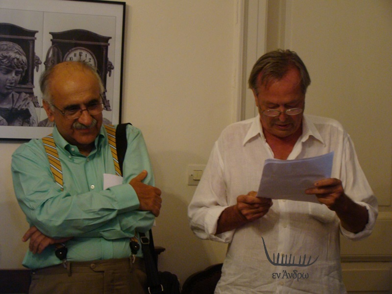 Ο Γκέστα διαβάζει στα ελληνικά το ευχαριστήριο του προς το ακροατήριο των εγκαινίων. Δίπλα του ο εξαιρετικός Μιχάλης Τιβέριος που ήταν ο ομιλητής στην παρουσίαση που έγινε. Φωτογραφία του 2012.