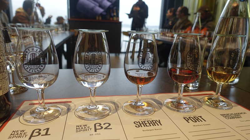 Στο τέλος της διαδρομής και των τεχνικών των ζυμώσεων ήρθε η ανταμοιβή μας που αντέξαμε την δοκιμασία της διάλεξης στα διάφορα επίπεδα του αποστακτηρίου: δοκιμή δύο ειδών τζιν, δύο ειδών τσέρυ, και ενός είδους ουίσκι. Το καλύτερο μέρος της παρουσίασης. Και η ανταμοιβή μας για τις 25 λίρες το άτομο που πληρώσαμε.