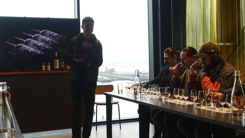 Ήταν το πιο ενδιαφέρον μέρος της ξενάγησης. Δοκιμάζαμε, πίναμε και παρακολουθήσαμε τους τρεις σκωτσέζους. Ήταν μια ιεροτελεστία ο τρόπος που ανάδευαν το ποτό, που το μύριζαν και που έπιναν. Είχαν στιλ οι μπαγάσες. Όλα πάνω τους έμοιαζαν σαν σε ταινία εποχής του Λάνθιμου. Αν μη τι άλλο το γκρουπ είχε γούστο και ποτά. Και δεν πλήξαμε καθόλου...