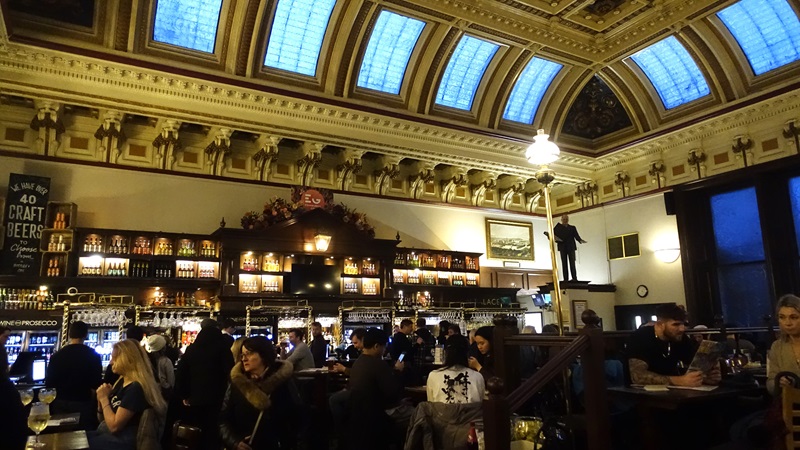 Η κεντρική σάλα τεράστια, Ένα μακρύ μπαρ γεμάτο κόσμο. Δεκάδες τραπέζια για ποτό και φαγητό. Διακόσμηση επιβλητική. Ταβάνια με υπέροχα γύψινα. Τζαμαρίες οροφής του 19ου αιώνα. Ένα τεράστιο σκηνικό και ψηλοτάβανο πολλά μέτρα για να χαζεύεις περισσότερο...