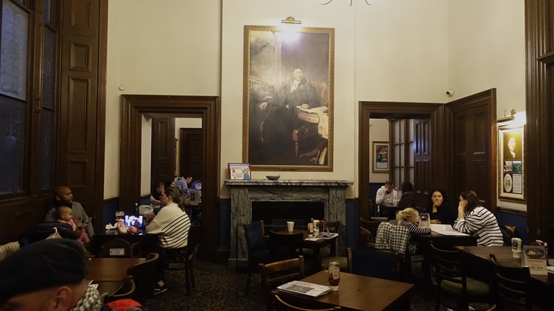 Στο μπροστινό που καθίσαμε οι τοίχοι του ήταν γεμάτοι βιβλιοθήκες με βιβλία. Προς ενημέρωση οι παλιές ιστορικές παμπ κατά τον 19ο αιώνα και μέχρι και το πρώτο μέρος του 20ου αιώνα εκτός από το ποτό είχαν και βιβλία και λειτουργούσαν και σαν εντευκτήρια και αναγνωστήρια. Μια παλιά ξεχωριστή βρετανική παράδοση που έκανε τους Βρετανούς τόσο διαφορετικούς και ιδιαίτερους σε σχέση με όλη την υπόλοιπη Ευρώπη, που δεν καν σκεφτεί την πολιτισμική και πολιτιστική χροιά της παμπ.