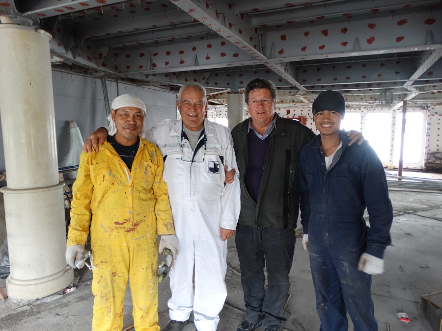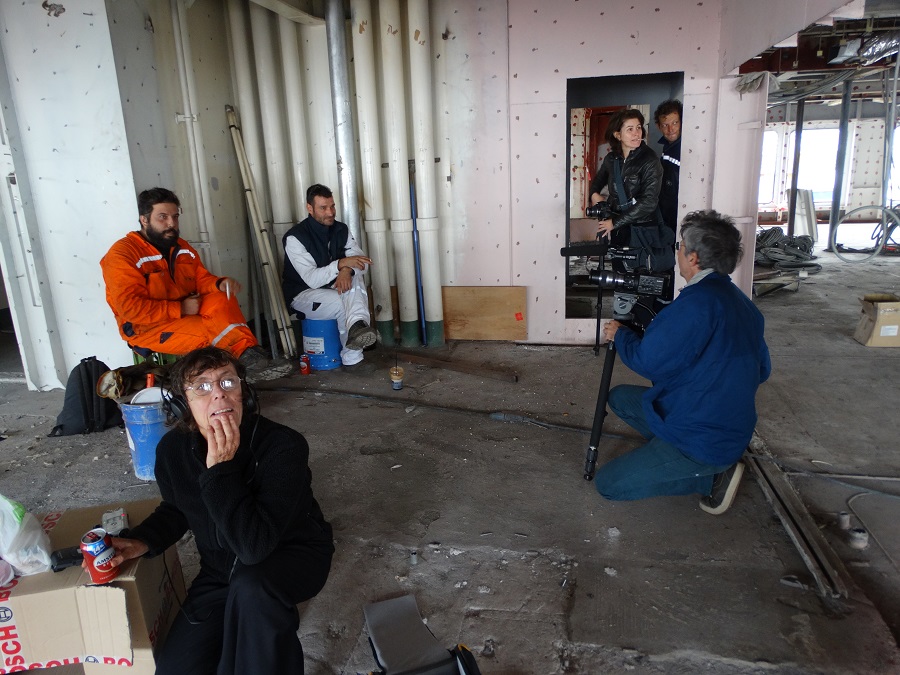 Ξάφνου πέφτουμε πάνω σε ένα κινηματογραφικό συνεργείο που δουλεύει  σε ένα ντοκιμαντέρ για τον γαλλικό κινηματογράφο και τηλεόραση με θέμα «χτίζοντας ένα πλοίο»! Γελάνε χαρούμενοι καθώς τους παίρνουμε φωτογραφία! Γύρω μας οι φιλιπινέζοι του παλιού πληρώματος, που το έφερε από την Ιαπωνία, καθαρίζουν για να μπουν την επομένη πάλι τα συνεργεία...
