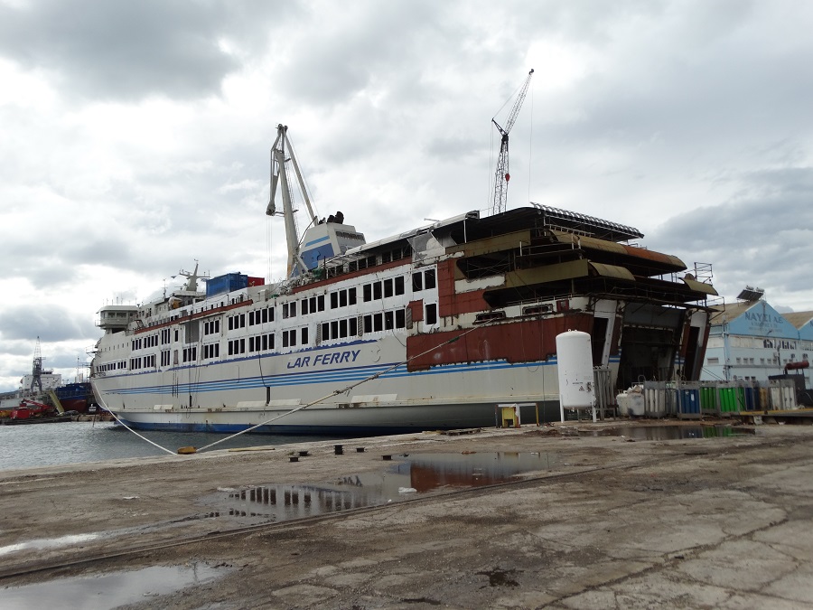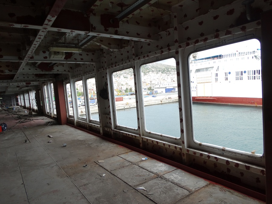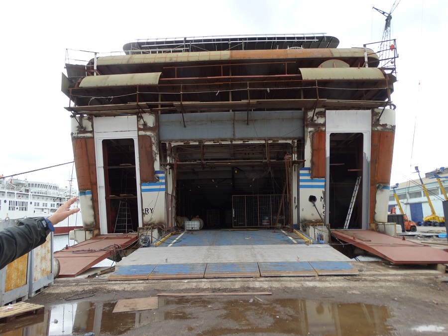 Από το πλάι και από πίσω. Διακρίνεται το νέο κατάστρωμα, που έχει προστεθεί πίσω από την τσιμινιέρα, οι δύο νέες πόρτες και οι καταπέλτες επιβατών που έχουν τελειώσει. Και ο κεντρικός καταπέλτης που κι αυτός έχει μεγαλώσει (το γκρίζο τμήμα είναι καινούριο). Μόλις βαφτούν οι λαμαρίνες θα αναδειχτεί το πλοίο.