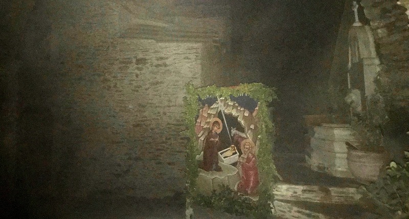 Αξημέρωτα ανήμερα Χριστούγεννα η ομίχλη και το χιονόνερο βαραίνουν πάνω στους Γερακώνες. Η εικόνα των Γέννησης στην υγρή, σκοτεινή και γεμάτη ομίχλη είσοδο του μοναστηρίου παραπέμπει στο παλιό χριστουγεννιάτιατικο τραγουδάκι: χιόνια στο καμπαναριό που Χριστούγεννα σημαίνει!!! (φωτ. Χαρίδημος).