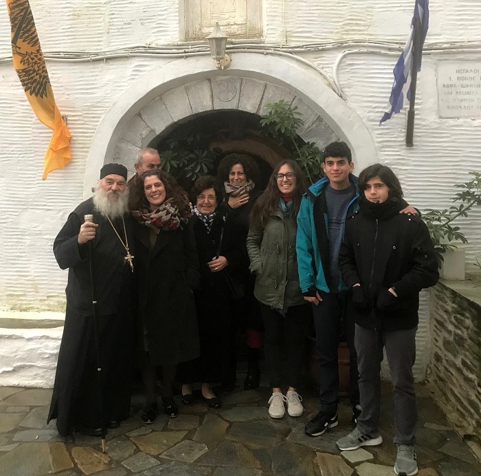 Και η απαραίτητη αναμνηστική φωτογραφία της μέρας. Η οικογένεια Σκόρδου από τα Αειπάτια με τον πατέρα Ευδόκιμο που τους κατευώδοσε στην εξώθυρα της Μονής (φωτ. Εν Άνδρω).