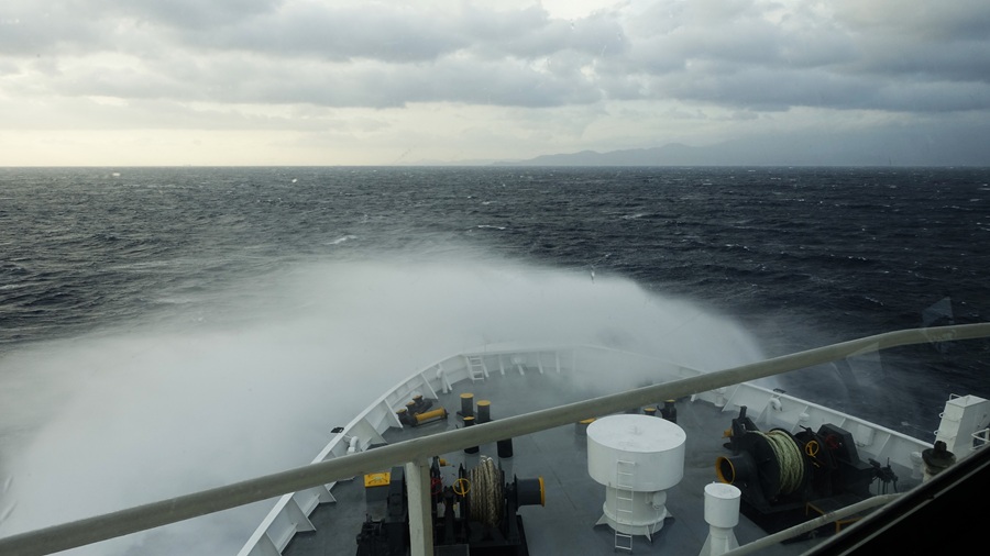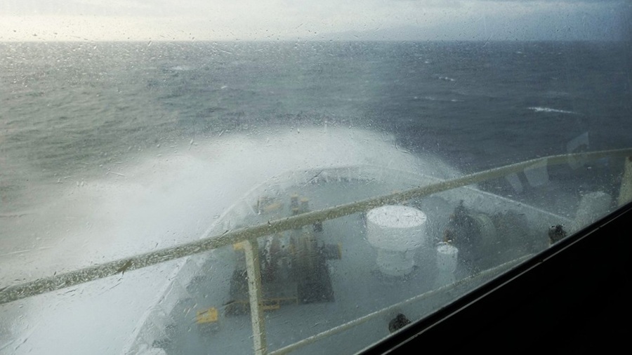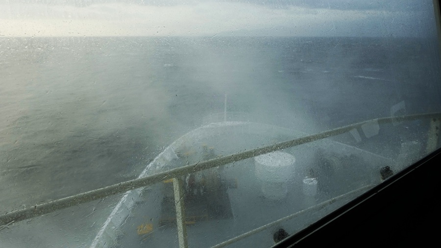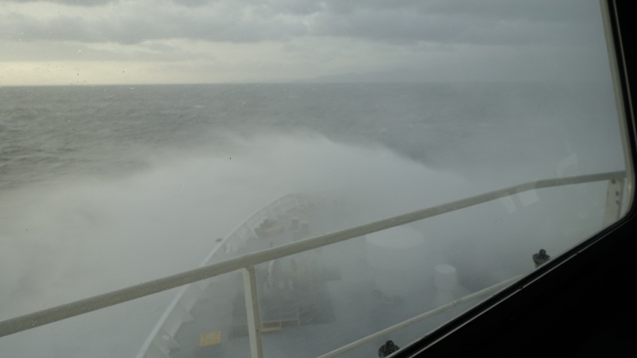 Βγάλαμε μερικές φωτογραφίες από την γέφυρα. Μετά αρχίσαμε να βιντεοσκοπούμε για μερικά λεπτά. Τα κύματα βουβά, ισχυρά, δυνατά. Η πλώρη σταθερή. Καλοτάξιδο βαπόρι, παρά τα κύματα, το κούνημα περιορισμένο.