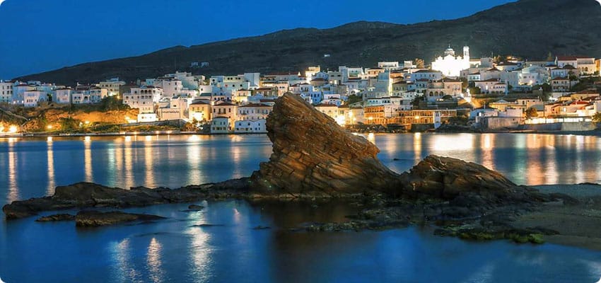 Η φωτισμένη νυχτερινή Χώρα από τον μισοφωτισμένο νυχτερινό Τούρλο. Τον μοναδικό βράχο "σήμα καταυεθέν" της αμμουδιάς του Νειμποριού. Μια εικόνα που λίγοι έχουν εστιάσει τη νύχτα...