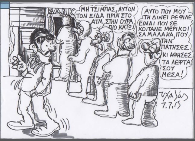 Σε αυτές τις δύσκολες στιγμές μόνη μας αναφορά η γνώση, η περίσκεψη, η ψυχή και η καρδιά μας. Αλλά και το χιούμορ μας. Γιατί η ζωή συνεχίζεται. Δεν τελειώνει μπροστά στα ΑΤΜ, όσο και αν δεν μπορούμε να κάνουμε χωρίς αυτά. Δεν τελείωσε με το δημοψήφισμα, όσο κι αν ξαφνιαστήκαμε με αυτό. Δεν τελειώνει με τις κρίσιμες διαπραγματεύσεις, όσο κι αν μας κρατούν σε αγωνία. Πέρα από την κρισιμότητα μπροστά στην ξαφνική ακινησία της χώρας μας είμαστε ακόμα εδώ. Πάμε στις δουλειές (όσοι έχουμε), κυκλοφορούμε, γράφουμε και σκιτσάρουμε τις μέρες μας. Και χαμογελάμε με την καθημερινότητα της ζωής μας. Χαμογελάμε με τα σκίτσα που σατιρίζουν τις αγωνίες του σήμερα και τις αντιθέσεις του χτες. Χαμογελάστε, λοιπόν, κι εσείς μια στάλα με τα μεγάλα. Αλλά και με τα μικρά.