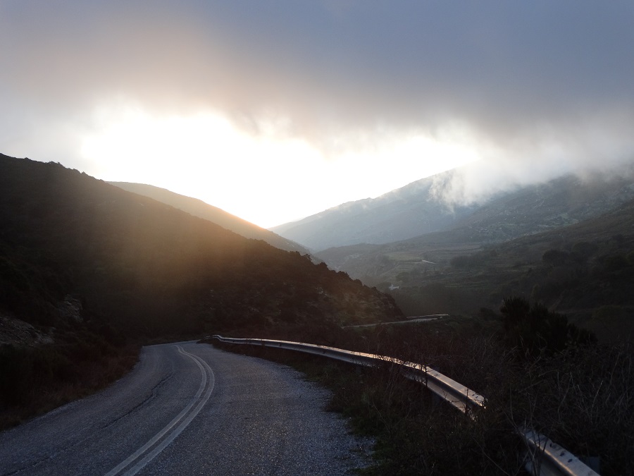 Ο δρόμος κάπου ανάμεσα στα βουνά και στα σύνεφα με τις τελευταίες αχτίδες του ήλιου.