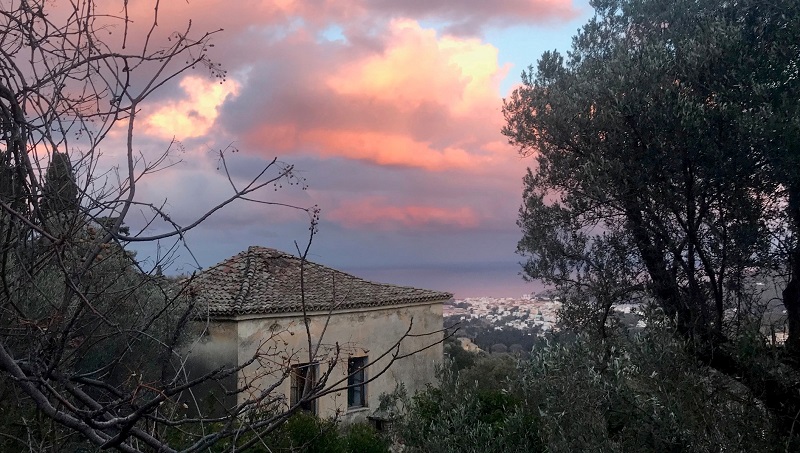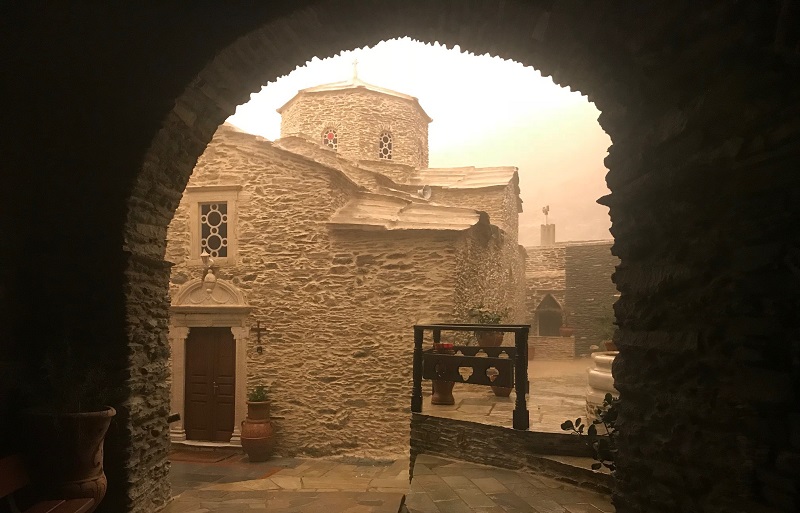 Η σκόνη όπως κατακάθισε λίγο νωρίτερα στο μοναστήρι της Παναχράντου δίνοντας ένα εξώκοσμο χρώμα στο περιβάλλον (φωτ. Χαρίδημος)