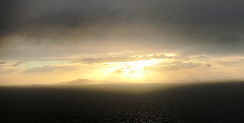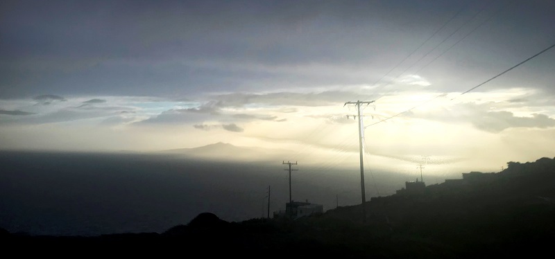 Η ίδια εικόνα από άλλη γωνία λίγα λεπτά αργότερα. Η σκόνη απλώνει παντού την θαμπάδα της. Ταυτόχρονα το σκοτάδι σβήνει σιγά-σιγά τα χρώματα. Οι ακτίνες του ήλιου εξακολουθούν να φωτίζουν την Γυάρο παράξενα (φωτ. Χαρίδημος).