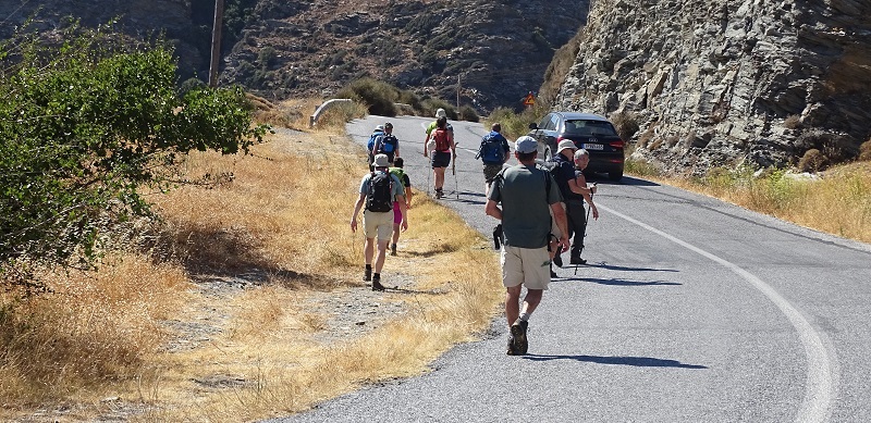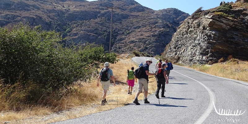 Σε μια άλλη άκρη της Άνδρου οι Βέλγοι πεζοπόροι πάνε ποδαρόροδρομο στον Κόρθι. Ξεκίνησαν από την Χώρα κι ελπίζουν να φτάσουν το μεσημέρι έχοντας διασχίσει τα 20 χιλιόμετρα που χωρίζουν τα δύο μέρη. Επιμένουν κι αυτοί να διατρέχουν την φύση και τα βουνά της Άνδρου καθώς η εποχή χαμηλώνει σιγά-σιγά προς τον χειμώνα.