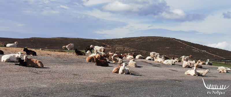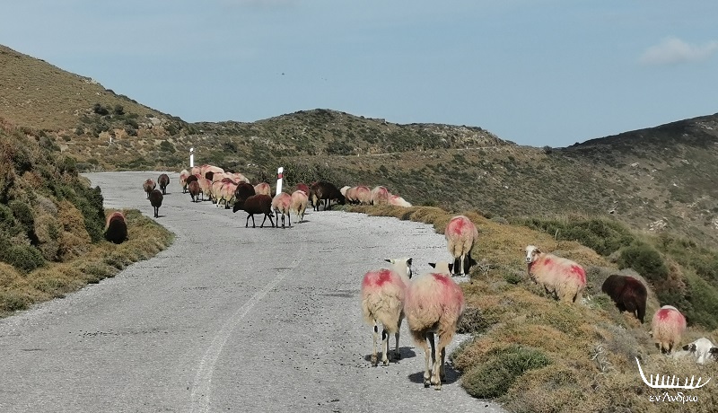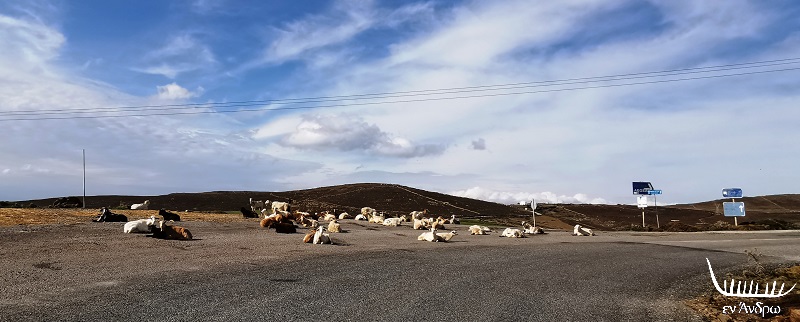 Μπορεί να μην βρήκαμε αυτοκίνητα στη διαδρομή μας. Όμως βρήκαμε κοπάδι πρόβατα να περπατάνε βαριεστημένα στην άσφαλτο. Μια άλλη Άνδρος. Μια άλλη διαδρομή στις εσχατιές ενός νησιού που λίγοι φτάνουν ακόμα και το καλοκαίρι. Κι όμως είναι τόσο ήρεμα όμορφο το καμπυλωτό τοπίο εκεί πάνω.