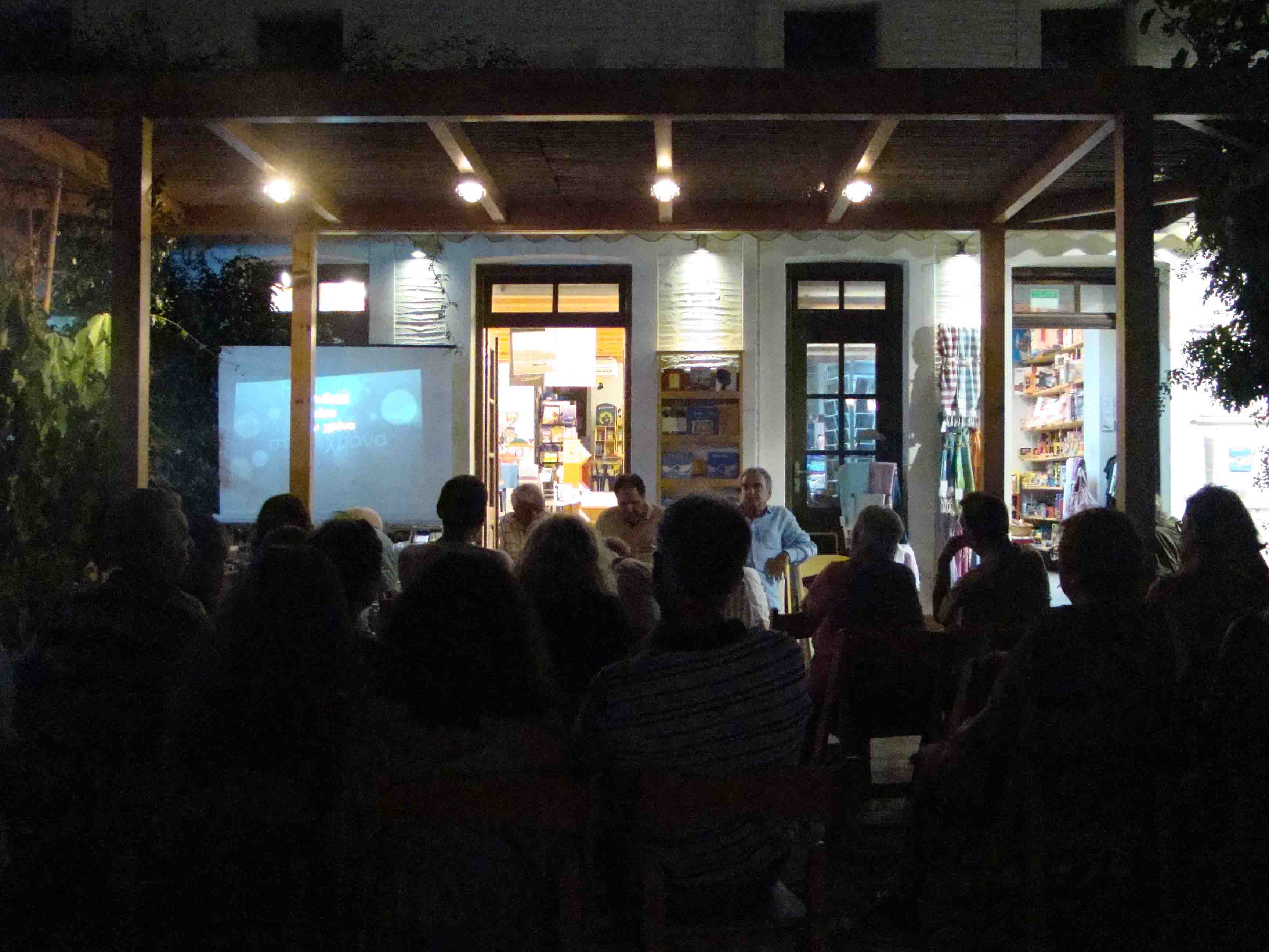 Τα θέματα που αναπτύχθηκαν ήταν πάλι όλα από το αφιέρωμα. Η οργάνωση εξαιρετική χάρη στο βιβλιοπωλείο «Αγορά Βιβλίου» και στον εργατικό και ταλαντούχο Δημήτρη Αντωνέλλο, που έχει φτιάξει μια εστία ανάγνωσης και πολιτισμού στο Κόρθι. Χώρος της εκδήλωσης η μικρή πλατεία στον πεζόδρομο του Όρμου Κορθίου. Το καφέ που μας φιλοξένησε πλήρως ηλεκτρονικά εξοπλισμένο: τηλεόραση-κομπιούτερ-υψηλή τεχνολογία. Όχι παίζουμε.
