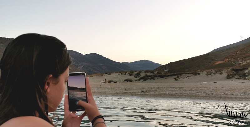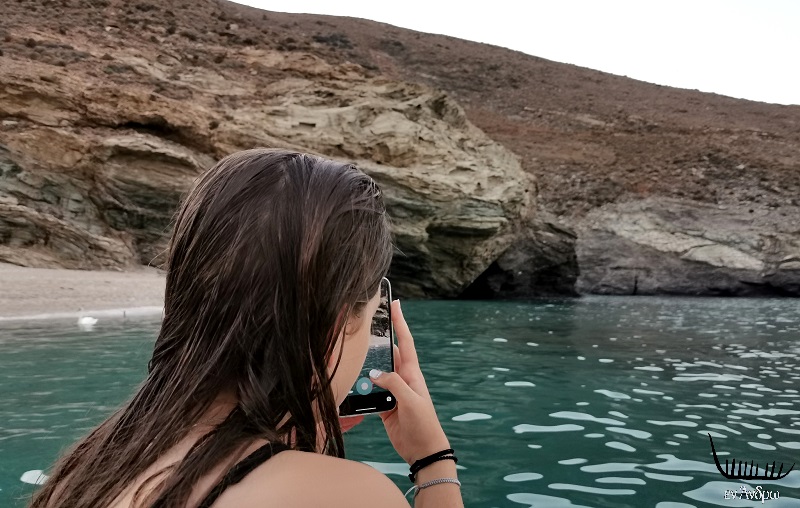 Τελευταία αποτύπωση του τοπίου. Η κοπέλα φωτογραφίζει ακόμα μια φορά με χαρούμενη διάθεση το πιο θηλυκό τοπίο της Άνδρου μια στιγμή πριν το αφήσει πίσω της για την βραδυνή επιστροφή στη Χώρα...