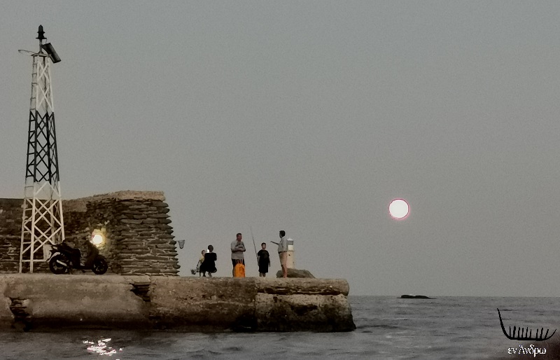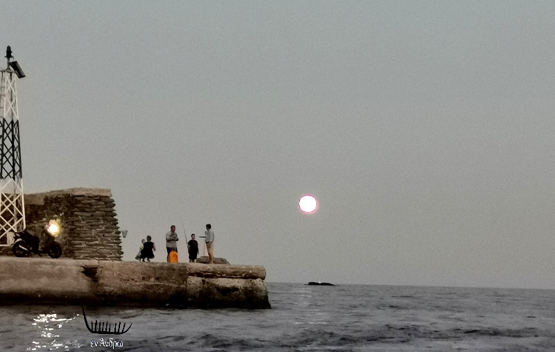 "Κοιτάξτε το φεγγάρι ανατέλλει από την θάλασσα" είπε η κοπέλα. Ήταν γύρω στις 8:30. Το μικρό σκάφος έτρεχε και κάθε απόπειρα φωτογραφίας ήταν μάταιη. Μπορεί να χάσαμε τις εντυπωσιακές αποχρώσεις των πρώτων στιγμών. όμως αποτυπώσαμε την ανθρώπινη παρουσία με τρόπο που λίγες φορές τα καταφέραμε. Οι ψαράδες στην άκρη της προβλήτας του λιμανιού της Χώρας συζητούν, ενώ πίσω δύο γυναίκες κοιτούν το φεγγάρι...