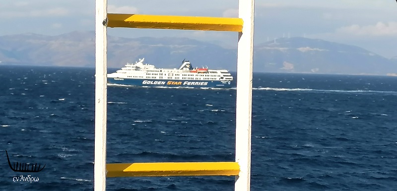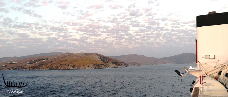 Τα πλοία συναντιούνται καθώς το ένα πάει και το άλλο έρχεται, μια αέναη κίνηση στην απεραντοσύνη του Αιγαίου, σε σταυροδρόμια που δεν τελειώνουν ποτέ… Μπροστά η Άνδρος, παραδομένη στο φθινοπωρινό λυκόφως στεφανωμένη από τα πρώτα σύννεφα του Σεπτέμβρη, όμορφη μέσα στις σκιές των βουνών της.