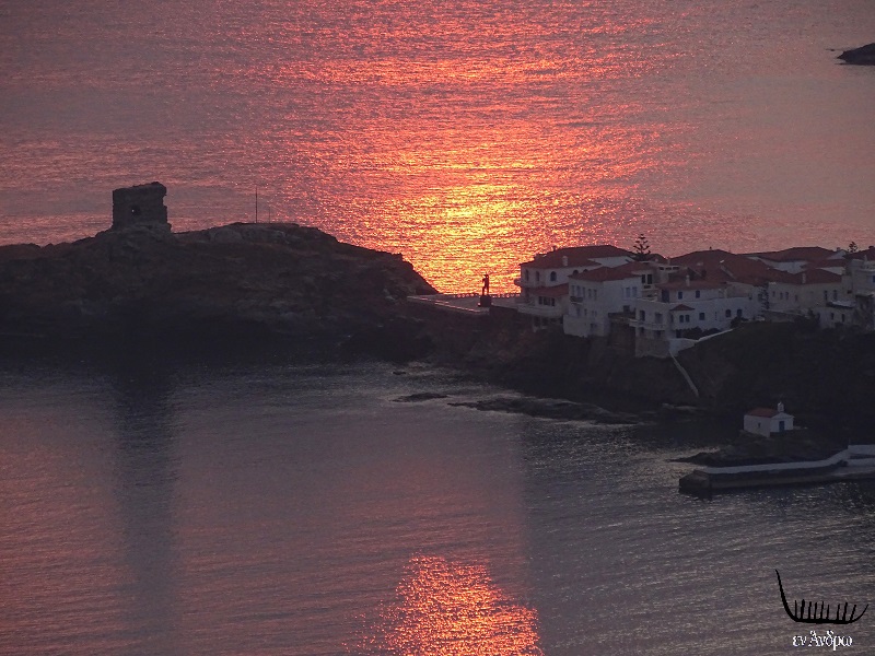 Αν η δυτική Άνδρος έχει μαγικά δειλινά, η ανατολική έχει ουράνιες ανατολές. Και οι ουράνιες ανατολές είναι εκεί που το κοσμικό σύμπαν σμίγει με την γη για μια στιγμή. Αυτή τη στιγμή ο ήλιος κι ο Θεός ρίχνουν το βλέμμα τους στην Άνδρο. Πρωινό και φτιάχνεις βαριεστημένος τον πρωινό καφέ. Παρασκευή. Σεπτέμβρης 2020. Κοιτάς αφηρημένος έξω από την μπαλκονόπορτα του σαλονιού... και την βλέπεις! Είναι εκεί και σε κοιτά! Απομένεις άναυδος να την κοιτάς κι εσύ. Είναι η στιγμή που ο πρωινός κατακόκκινος ήλιος ζυγιάστηκε μοναδικά πάνω από την Χώρα κι έριξε την κατακόκκινη και σκοτεινή ματιά του στο διάκενο ανάμεσα στο Κάτω και στο Μέσα Κάστρο του Μαρίνου Δάνδολου, στο διάκενο ανάμεσα στο χτες και στο σήμερα...