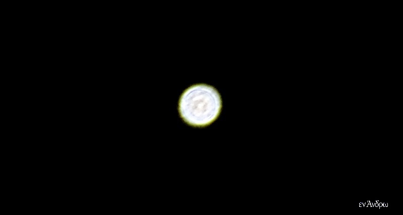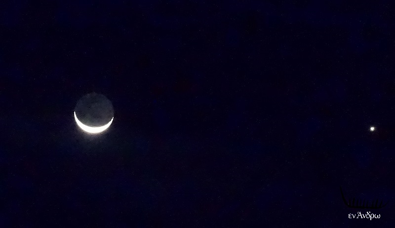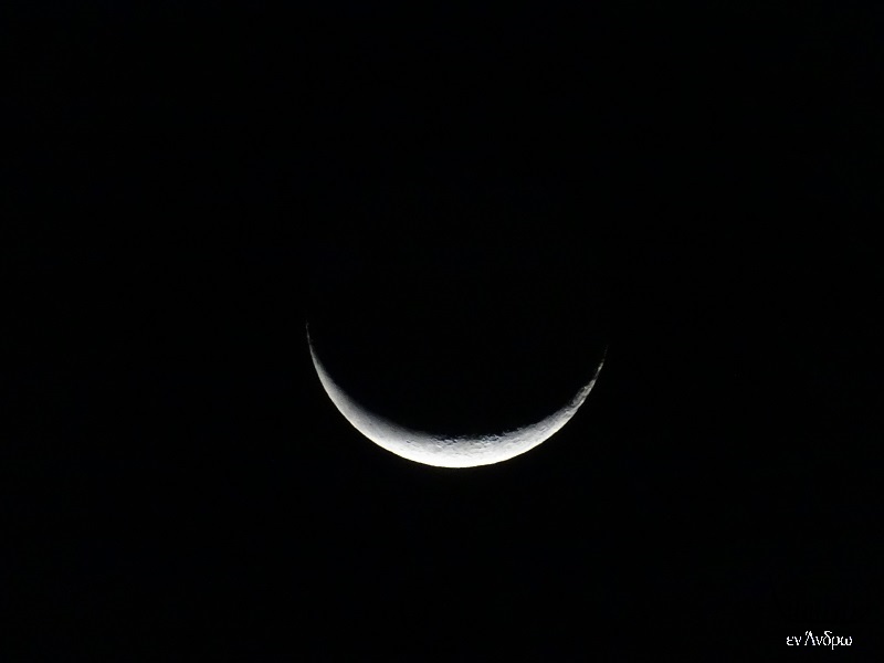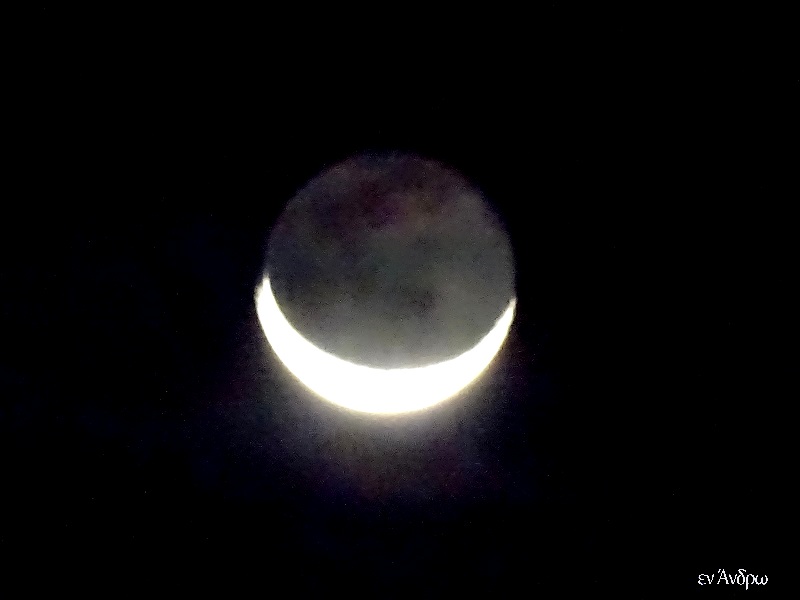 Αρχικά είδαμε την κομψή, μαγική, αιθέρια ημισέληνο στον ουρανό. Όμως αν πρόσεχες θα έβλεπες πως ήταν τέτοια η λάμψη της και η γωνία που φωτιζόταν από τον ήλιο (από κάτω προς τα πάνω) που αχνοδιαγραφόταν η σκιά ολόκληρου του φεγγαριού. Μια ημισκότεινη πανσέληνος!!! Η ολόλαμπρη ημισέληνος φώτιζε υπό γωνία και τον υπόλοιπο σκοτεινό εαυτό της!!! Ένα σπάνιο φαινόμενο πάνω από την Άνδρο και το Αιγαίο...