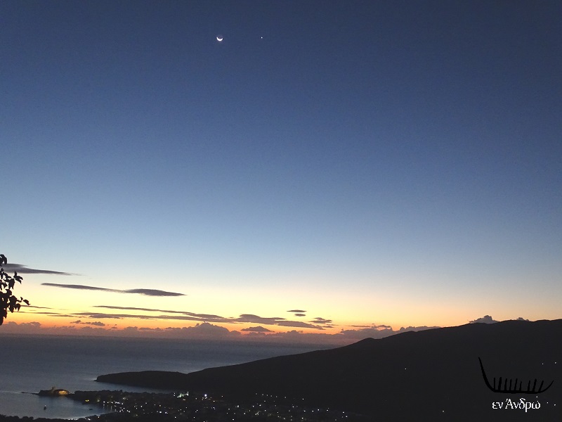 Ανοίγεις το πλάνο. Η σκοτεινή πρωινή Άνδρος κι απέναντι η επερχόμενη ανατολή. Και πάνω η ολοφώτεινη ημισέληνος και μαζί της και το σκοτεινό φεγγάρι που αχνοδιαγράφονται μέχρι να ξεπροβάλλει ο ήλιος ο ηλιάτορας...
