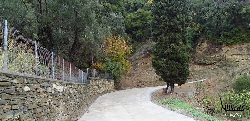Και να που σήμερα ξαφνικά βρήκαμε ένα τσιμεντένιο τεχνικό έργο, ένα γεφυράκι, κι έναν φαρδύ σχετικά τσιμεντόδρομο που συνέχιζε την διαδρομή μέχρι τον Άγιο Τρύφωνα. Ρωτήσαμε και μάθαμε πως έγινε μόλις πριν ένα μήνα από τον Δήμο Άνδρου στα πλαίσια των συνεχιζόμενων μικρών έργων που γίνονται στις Στενιες μετά την περσινή καταστροφή. Είναι θετικό που η διοίκηση δεν τους ξέχασε και συνεχίζει μαζί με τα γνωστά έργα στη Χώρα και στις γύρω περιοχές και τα μικρά έργα που έχουν ανάγκη τα μικρά χωριά για να υπάρξουν κι αυτά...