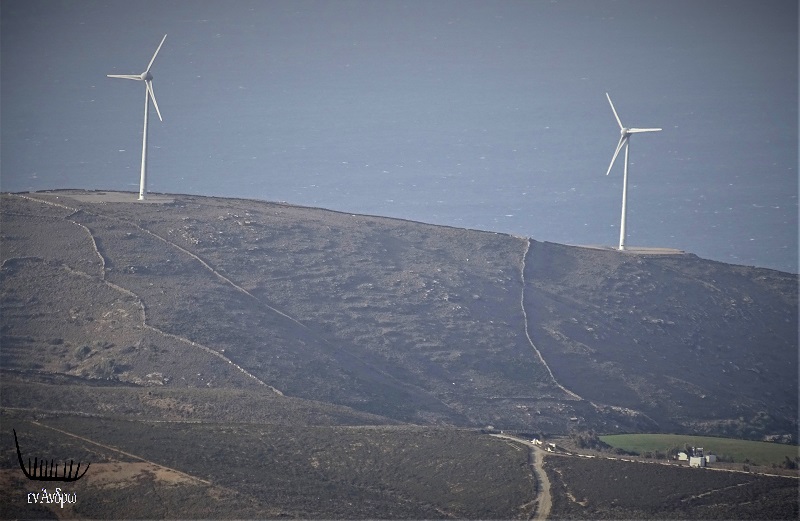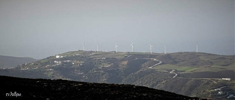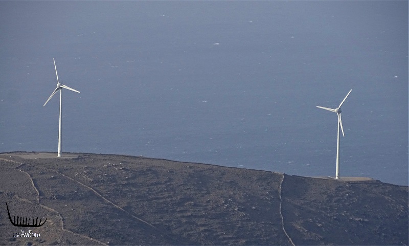 Οι τρεις ανεμογεννήτριες της Enteka μετά το Καλυβάρι προς την μεριά του Καμπανού. Στη φωτογραφία όπως αυτές φαίνονται με τηλεφακό από την Ράχη της Λειβάδιζας. Χωρίς τηλεφακό φαίνονται αμυδρά. "Είναι η συνεισφορά της Άνδρου στο μέγα ζήτημα της κλιματικής αλλαγής" σχολίασε ο καθηγητής Γιάννης Τριδήμας από τις Μυρμηγκιές...