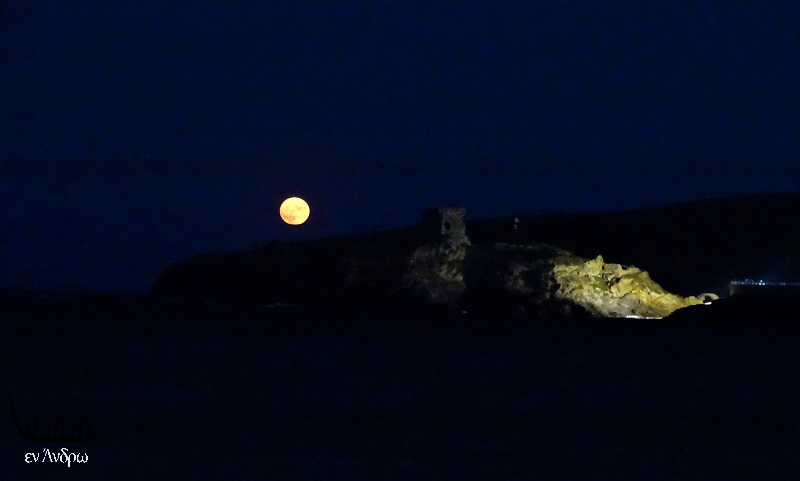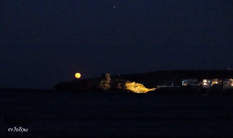 Η πανσέληνος του Αυγούστου ανηφορίζει στον ουρανό. Δεξιά διακρίνεται το Κάστρο και μέρος της νυχτερινής Χώρας.