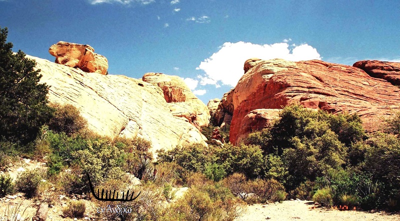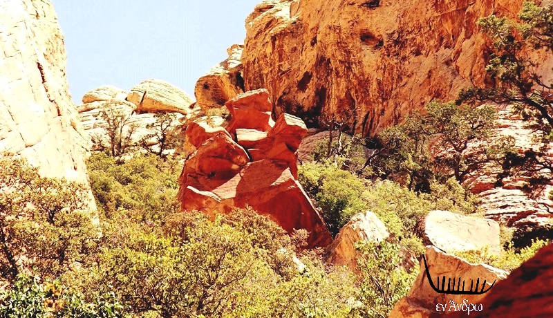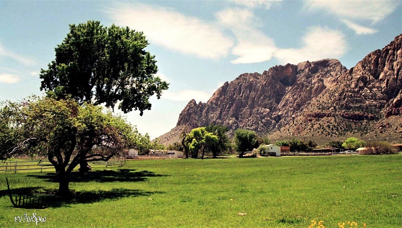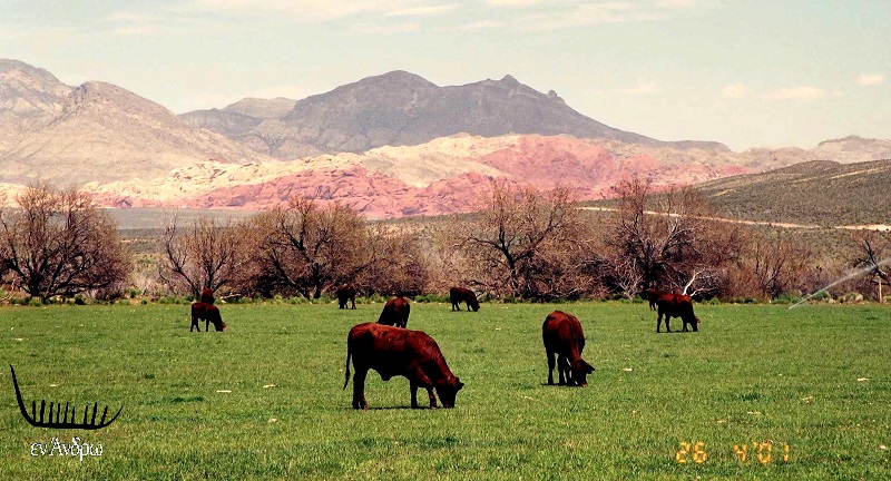 Οι αντιθέσεις που συναντά ο ταξιδιώτης απίστευτες. Στη μέση της ερήμου οι πηγές αλλάζουν τελείως την ζωή. Ένα καταπράσινο ράντσο με αγελάδες σκουρο-κόκκινες να βόσκουν αμέριμνα, ενώ στο φόντο το κόκκινο πέτρινο φαράγγι λέει μια άλλη διαφορετική ιστορία. Το σκηνικό μοιάζει ψεύτικο. Κι όμως είναι αληθινό. Είμαστε στην άκρη της κοιλάδας της φωτιάς (valley of fire) του Red Rock Canyon.